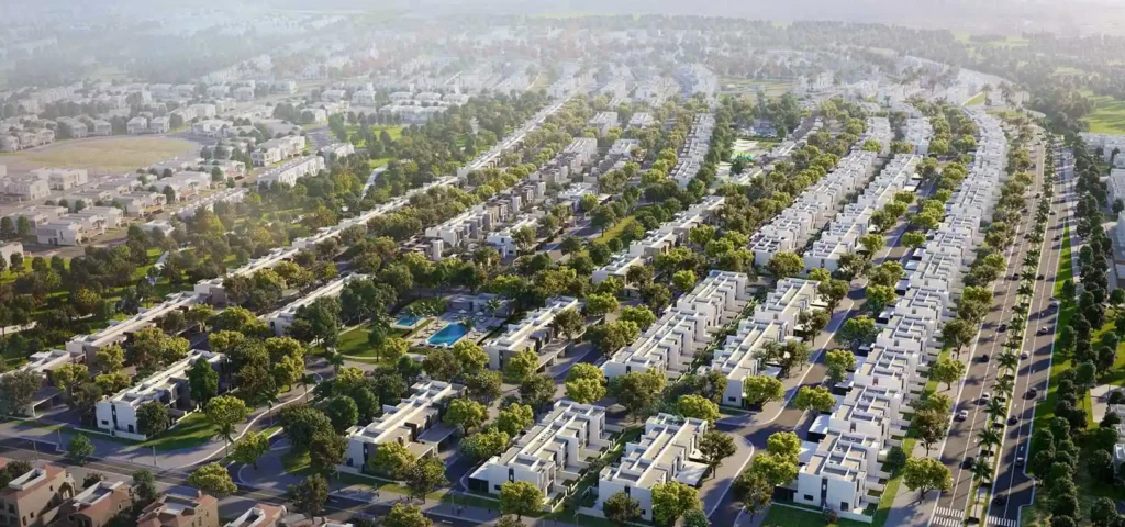 The community sits within the Dubailand expansion corridor and spans a substantial footprint with over 4,500 homes planned across multiple sub-communities. The design philosophy leans into low-density living: wide streets, generous plot sizes, open green belts, and a clear focus on families.